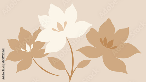 Elegant floral illustration featuring three simplified flowers in soft neutral tones