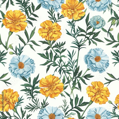 Elegant Floral Seamless Pattern in Marlin Blue and Golden Hues.