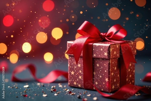 Elegant gift box, sparkling lights, red ribbon, christmas, december