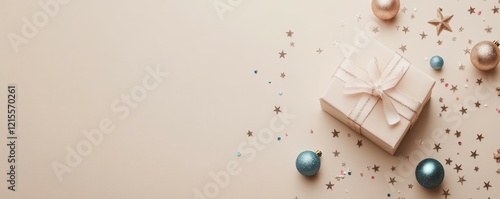 Elegant gift box with bow surrounded by glittering ornaments and stars