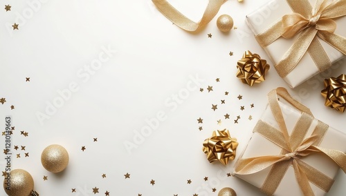Elegant Gift Boxes with Gold Ribbons and Decorative Ornaments on a Light Background for Holiday Celebrations and Festive Occasions