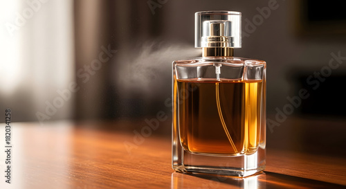 Elegant glass bottle of amber colored perfume or cologne on a wooden surface