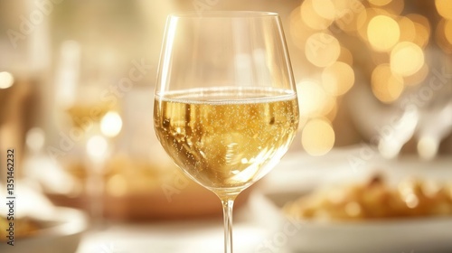Elegant Glass Of Sparkling Chardonnay With Bubbles On Table In Bright Dining Setting