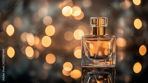 Elegant glass perfume bottle with golden liquid and bokeh lights