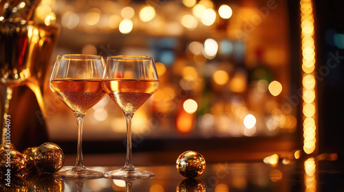 Elegant glasses of champagne on bar counter with warm bokeh lights in background