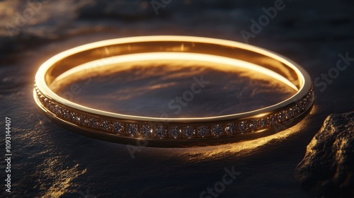 Elegant Gold Bangle with Diamonds Reflecting Radiant Light on a Rustic Surface, Perfect for Accessories or Jewelry Illustrations in Fashion Photography
