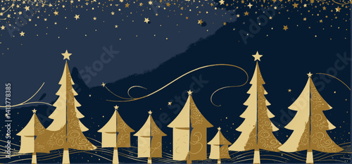 Elegant Gold Christmas Trees on Navy Background with Sparkling Stars Festive Holiday Scene for Cards Wallpapers and Decorations Christmas_Theme