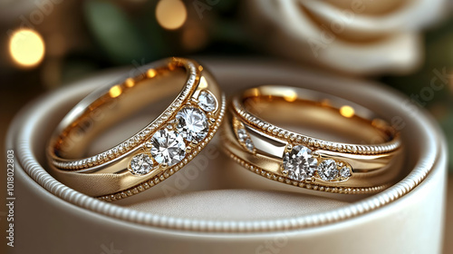 Elegant gold wedding rings adorned with sparkling diamonds.