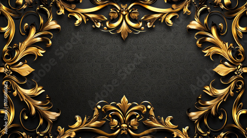 Elegant golden floral design on a black background with baroque-inspired elements, symmetrical patterns, and detailed ornamentation, creating a luxurious and vintage look. Invitation card. Copy space