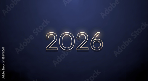 Elegant golden outline numbers 2026 on dark blue background with subtle light reflections and shadow effect