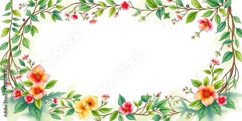 Elegant greenery & floral wreath border on watercolor background, intertwined leaves & vines, texture, elegant