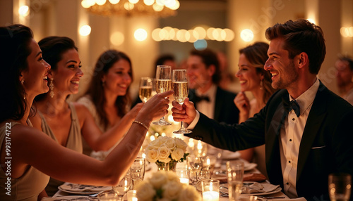 Elegant guests toast at a gala, immersed in a sophisticated, celebratory ambiance.