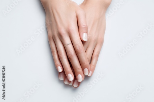 Elegant hands with manicured nails placed together on a soft surface
