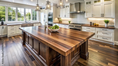 Elegant Hardwood Island in a Bright, Modern Kitchen with White Cabinets and Large Windows