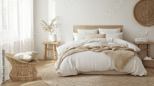 Elegant home interior with comfortable bed soft light natural textures and modern design for peaceful living