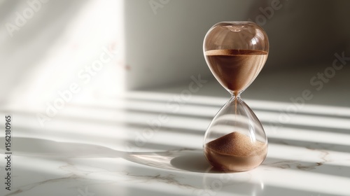Elegant hourglass on marble surface casting shadows in soft light details of time passing and patience visual metaphor
