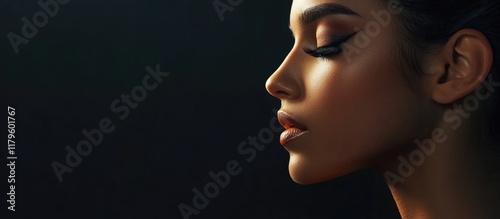 Elegant Indian Bridal Makeup with Dramatic Eyeliner and Glossy Skin Featuring a Profile View Against a Dark Background with Text Space