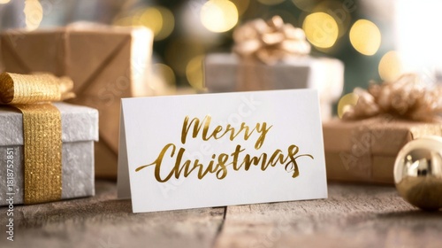 Elegant invitation or greeting card mockup featuring a beautifully arranged gift box alongside delicate plant twigs, creating a festive and cheerful atmosphere perfect for holiday greetings,