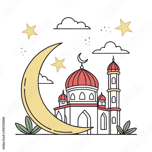 Elegant Islamic Mosque and Crescent Moon Illustration