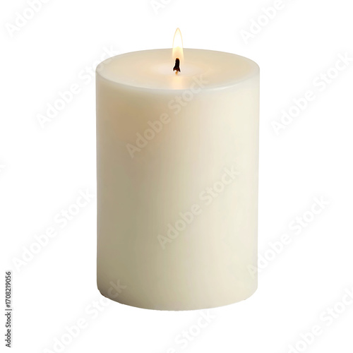 Elegant ivory candle with flickering flame white background, isolated on transparent background