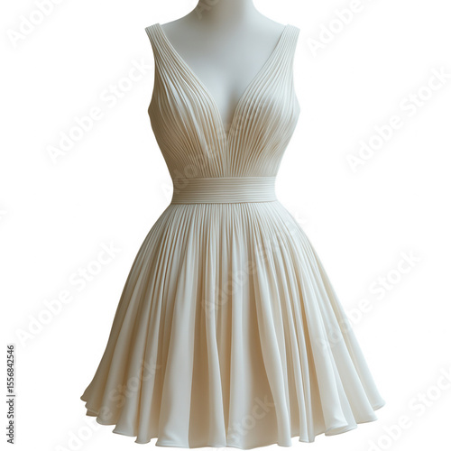 Elegant ivory pleated cocktail dress with a deep v neckline and a cinched waist presented on a mannequin isolated on transparent background