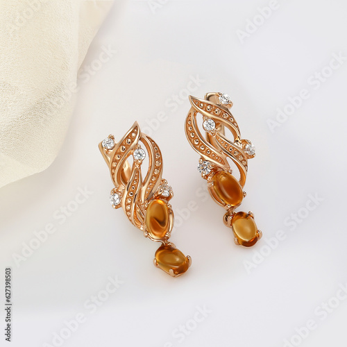 Elegant jewelry set. Jewellery set with gemstones. Jewelry accessories collage. Product still life concept. Ring, necklace and earrings.
