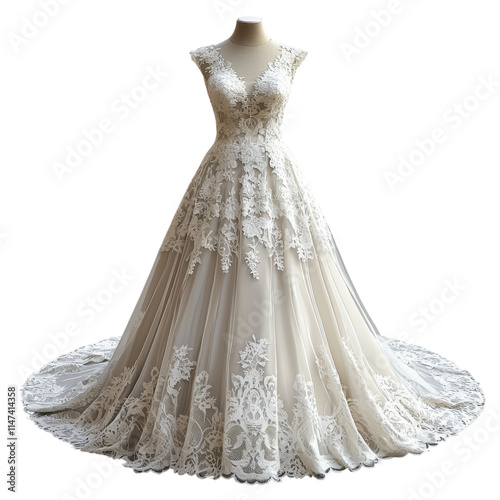 Elegant Lace Wedding Dress on Display Isolated on transparent background