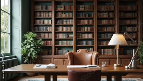 Elegant library room offers classic professional workspace. Wooden desk, comfortable leather chair, full bookshelves. Window provides natural light for intellectual study focused work. Green plant,