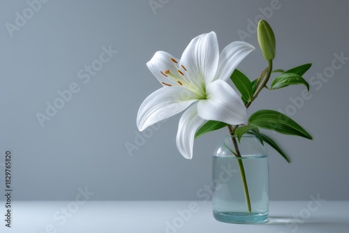 Elegant Lily in a Glass Vase: A pristine white lily, gracefully positioned in a clear glass vase, exudes a sense of purity and serenity, surrounded by lush green foliage and a minimalistic backdrop.