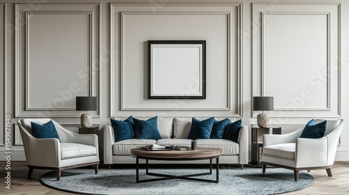 Elegant living room scene with light beige furniture and navy blue accents.