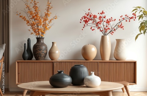 Elegant living room with decorative vases and branches on a wooden cabinet. Features beige and natural tones, highlighting simplicity and comfort. Includes a coffee table with modern ceramic pieces.