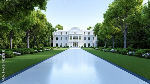 Elegant mansion with a manicured lawn and pathway.