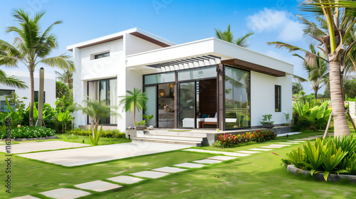 Elegant Minimalist One-Story House with Lush Lawn and Large Windows, American Individual Architecture Style