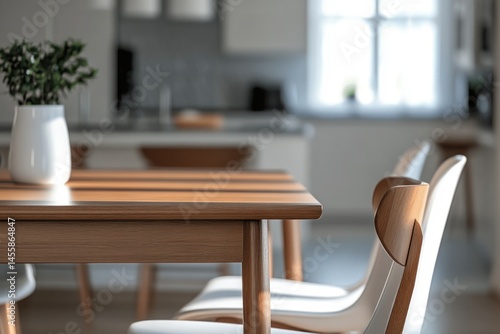 elegant modern dining setup with table, chairs, kitchen island in background