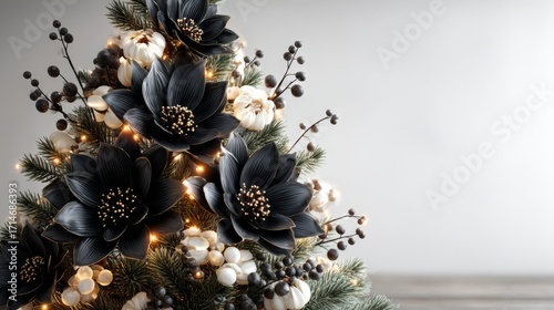 Elegant monochrome Christmas tree decoration, sophisticated, for modern festive holiday decor in black, white, and gold against a light background with copy space