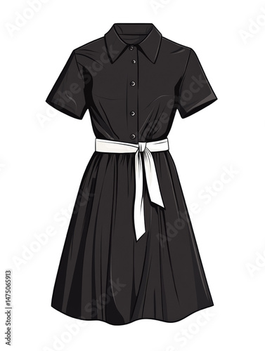 Elegant monochrome dress illustration with a contrasting white sash, isolated element on transparent background