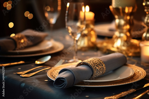 Elegant napkin. Elegant table setting. Selective focus. Romantic dinner setting with elegant napkin.