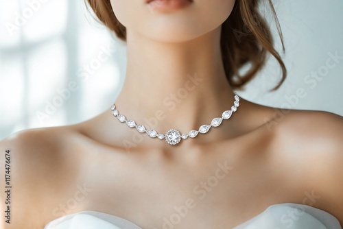 Elegant necklace adorns a woman's neck, complementing her bridal attire.