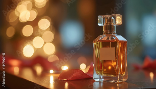 Elegant perfume bottle with blurred festive lights background. Warm amber liquid in clear glass container with blank label for custom text. Sophisticated luxury fragrance.
