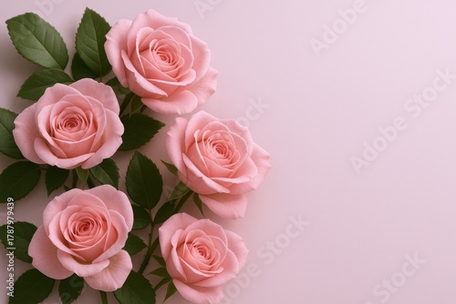 Elegant Pink Roses with Green Leaves on a Soft Pink Background for Romantic Occasions