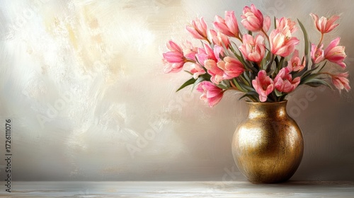Elegant Pink Tulips in a Golden Vase: A Still Life Masterpiece
