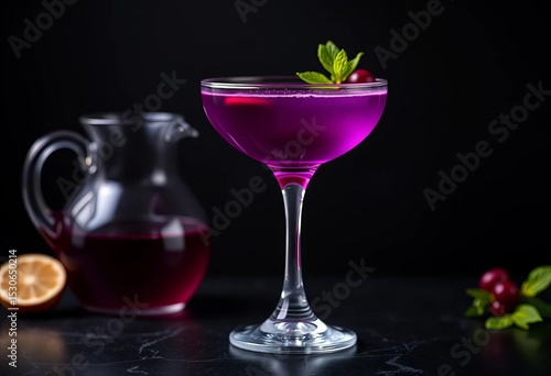 Elegant purple cocktail in coupe glass, pitcher nearby, black backdrop, coupe, creamy