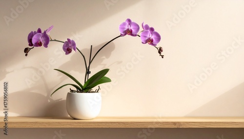 Elegant purple orchid plant with vibrant blooms and lush green leaves rests on a modern wooden shelf, bathed in soft natural light creating a serene home decor scene.