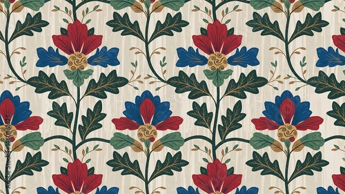 Elegant Red Blue Floral Textile Design with Oak Leaves on Beige