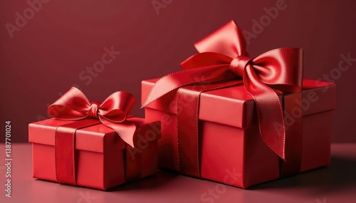 Elegant red ribbon tied gift boxes, gold accents, texture, christmas, detail