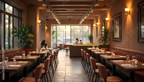 Elegant restaurant interior with set tables, warm lighting, and blurred figures in the background