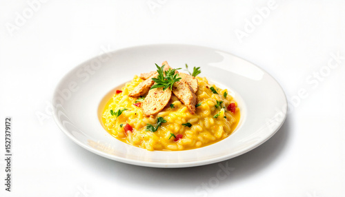 Elegant saffron risotto with garnish on white plate, fine dining concept