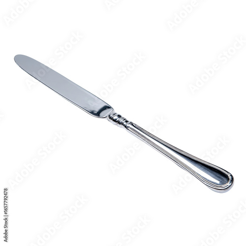Elegant silver dinner knife with ornate handle gleams, ready for sophisticated dining experiences.