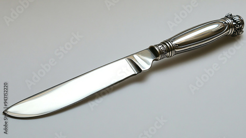 Elegant silver knife with ornate handle, perfect for dining settings and culinary presentations.