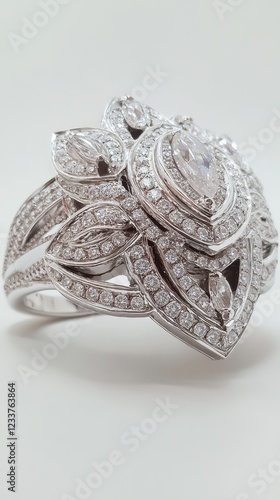 Elegant Silver Ring with Intricate Design and Sparkling Diamonds